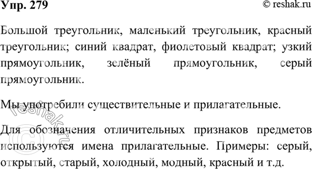 279 Назовите изображённые на рисунке фигуры и их отличительные признаки. Слова каких частей речи вы употребили? Слова какой части речи используются для обозначения отличительных признаков предметов?