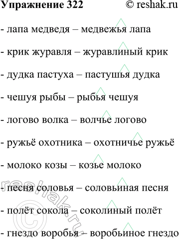 322 Запишите словосочетания, заменив форму родительного падежа имени существительного притяжательным прилагательным, обозначьте суффиксы, с помощью которых они образованы. Лапа медведя, крик журавля, дудка пастуха, чешуя рыбы, логово волка, ружьё охотника, молоко козы, песня соловья, полёт сокола, гнездо воробья.
