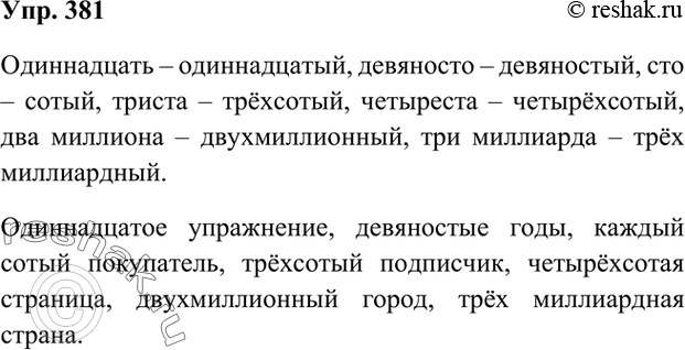 381 Прочитайте и запишите количественные числительные. 11, 90, 100, 300, 400, 2 000 000, 3 000 000 000. 11 – одиннадцать 90 – девяносто 100 – сто 300 – триста 400 – четыреста 2 000 000 – два миллиона 3 000 000 000 – три миллиарда Образуйте от этих количественных числительных порядковые.