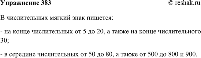 383 Используя сведения таблицы, расскажите о правилах написания ь в числительных. Ь пишется: На конце От 5 до 20 и 30 В середине слова От 50 до 80 От 500 до 800, 900 В числительных мягкий знак пишется: