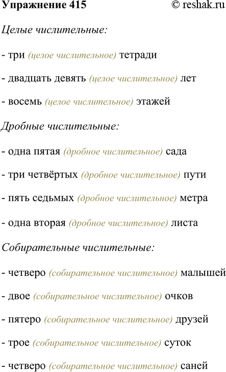 415 В каждом словосочетании определите разряд количественных числительных, впишите их в соответствующую колонку таблицы.