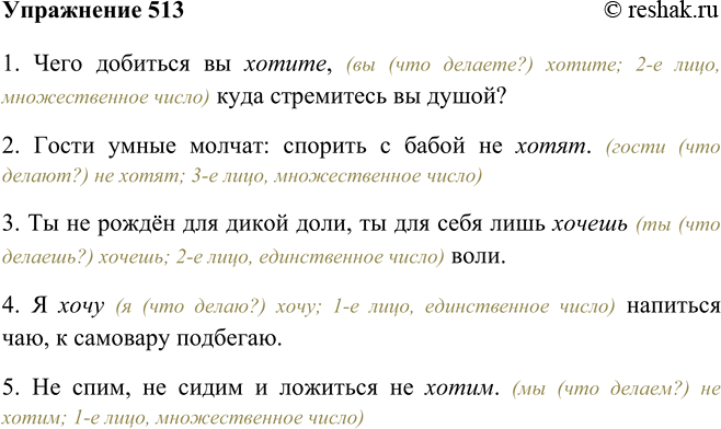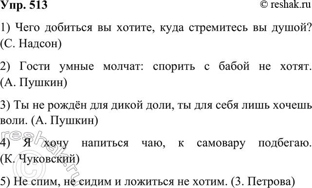 1) Чего добиться вы (хотеть), куда стре-митесь вы душой? (С. Надсон) 2) Гости умные молчат: спорить с бабой не (хотеть). (А. Пушкин) 3) Ты не рождён для дикой доли, ты для себя лишь (хотеть) воли. (А. Пушкин) 4) Я (хотеть) напиться чаю, к самовару подбегаю. (К. Чуковский) 5) Не спим, не сидим и ложиться не (хотеть). (3. Петрова)