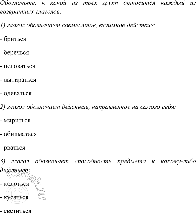 С помощью цифр над словом обозначьте, к какой из трёх групп относится каждый из возвратных глаголов: