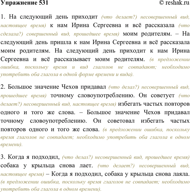 531 Прочитайте предложения, обращая внимание на вид и время глаголов. Устно отредактируйте предложения. В каком предложении нет ошибки? 1) На следующий день приходит к нам Ирина Сергеевна и всё рассказала моим родителям.