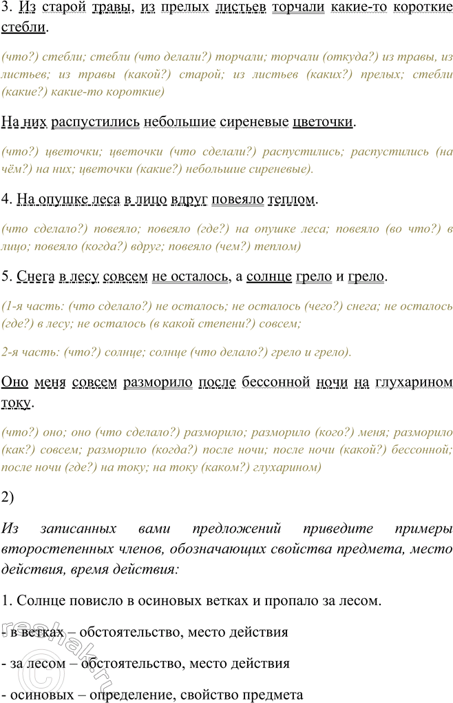 3. Из старой травы, (запятая между однородными обстоятельствами) из прелых листьев (разделительный мягкий знак перед гласной е) торчали какие-то короткие (проверочное слово: коротко) стебли. На них распустились (приставка перед основой на глухой согласный) небольшие (можно заменить синонимом: маленькие) сиреневые цветочки. (проверочное слово: цвет)