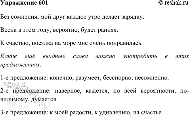 601 Составьте предложения с вводными словами, выразив уверенность в том, что каждое утро ваш друг будет делать зарядку; предположение о том, что весна в этом году будет ранняя; удовлетворение по поводу поездки к морю. Запишите эти предложения, употребив вводные слова без сомнения, вероятно, к счастью. Какие ещё вводные слова можно употребить в этих предложениях?