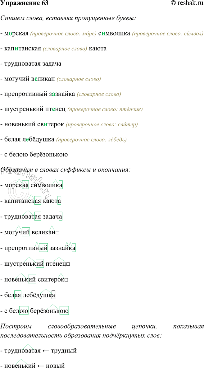 63 Спишите слова, вставляя пропущенные буквы. Обозначьте в словах суффиксы и окончания. Постройте словообразовательные цепочки, показывая последовательность образования подчёркнутых слов. М..рская символика, кап..танская каюта, трудноватая задачка, могучий в..ликан, препротивный з..знайка, шустренький пт..нец, новенький св..терок, белая л..бёдушка, с белою берёзонькою.