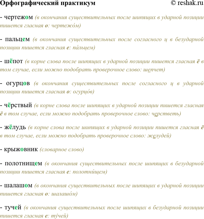 Орфографический практикум Чертеж…м, пальц…м, ш…пот, огурец…в, ч…рствый, ж…лудь, крыж…вник, полотнищ…м, шалаш…м, туч…й. - чертежом (в окончания существительных после шипящих в ударной позиции пишется гласная о: