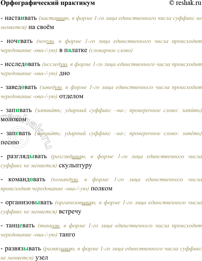 Орфографический практикум Наста…вать на своём, ноч…вать в п…латке, исслед…вать дно, завед…вать отделом, зап…вать молоком, зап…вать песню, разгляд…вать скульптуру, команд…вать полком, организо…в…вать встречу, танц…вать танго, развяз…ть узел.