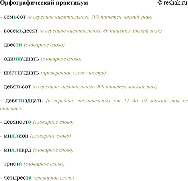 Орфографический практикум Сем(?)сот, восем(?)десят, двести…, оди(н, нн)адцать, шес(?)надцать, девят(?)сот, девят(?)надцать, девяност…, ми(л, лл)ион, ми(л, лл)иард, трист…, четырест… . - семьсот (в середине числительного 700 пишется мягкий знак) - восемьдесят (в середине числительного 80 пишется мягкий знак) - двести (словарное слово) - одиннадцать (словарное слово) - шестнадцать (проверочное слово: