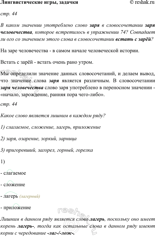 Лингвистические игры, задачки стр. 44 В каком значении употреблено слово заря в словосочетании заря человечества, которое встретилось в упражнении 74? Совпадает ли ого со значением этого слова в словосочетании встать с зарёй?