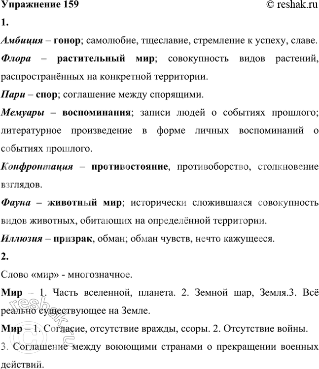 159. 1. Подберите к заимствованным словам синонимы (синонимичные словосочетания). Амбиция – гонор; самолюбие, тщеславие, стремление к успеху, славе. Флора – растительный мир;