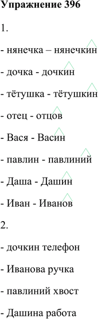 396. 1. Образуйте отданных существительных притяжательные прилагательные. - нянечка – нянечкин - дочка - дочкин - тётушка - тётушкин - отец - отцов - Вася - Васин - павлин - павлиний - Даша - Дашин - Иван - Иванов 2.