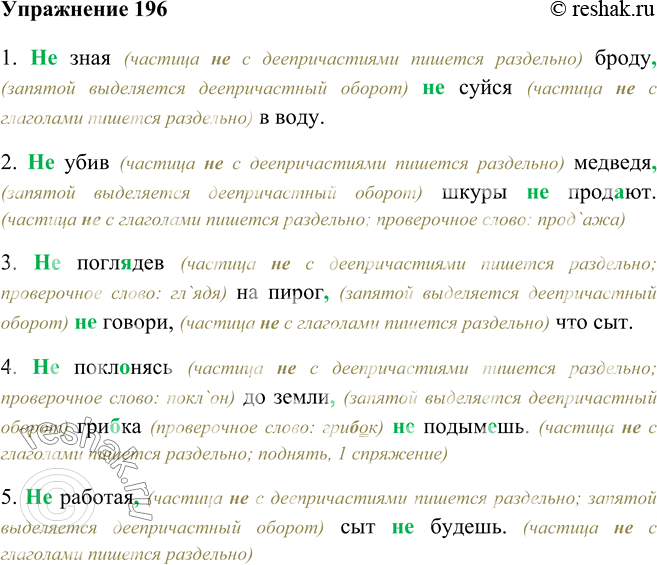 Спишите пословицы, раскрывая скобки и расставляя пропущенные запятые. Обозначьте орфограммы «Не с глаголами» и «Не с деепричастиями». Подберите к выделенному слову однокоренные слова и запишите их. Обозначьте части слов, поставьте ударение.