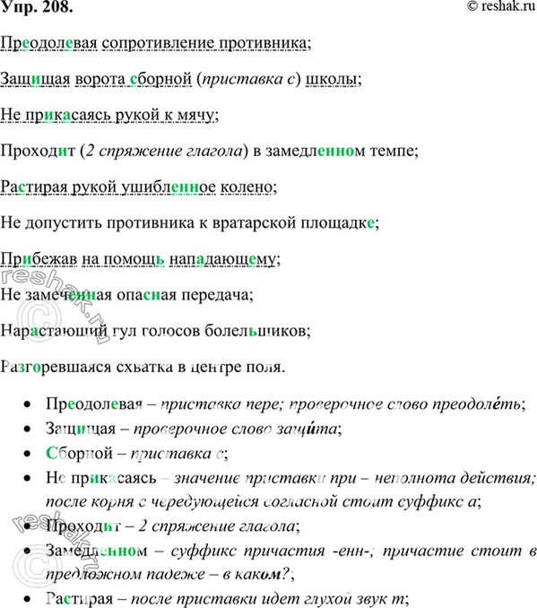 Пр..дол..вая сопротивление противника; защ..щая ворота(з, с)бор-ной школы; (не)пр..к..саясь рукой к мячу; проход..т в замедл..н..м темпе; ра(з, с)тирая рукой ушибл..ное колено; (не)допустить противника (к)вратарской площадк..; пр..бежав (на)помощ(?) нап..дающему; (не)замеч..ная защитником опас(?)ная передача; нарастающий гул голосов болел(?)щиков; ра(з, с)г..ревшаяся схватка (в)центре ноля.