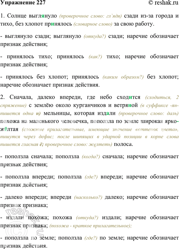 1. Солнце выгл..нуло сзади из-за города и тихо, без хлопот пр..нялось за свою работу. 2. Сначала, далеко впереди, где небо сходится с землёю около курганчиков и ветря(н, нн)ой мельницы, которая изд..ли похожа на маленького человечка, поползла по земле широкая (ярко)ж..лтая3 полоса. 3. Полоса света, подкравшись сзади, шмыгнула через брич(?)ку и лошадей, понеслась навстречу другим полосам, и вдруг вся широкая степь (с, з)бросила с себя утре(н, нн)юю полутень, улыбнулась и засв..ркала росой. 4. От стройной фигуры и зелёной одежды тополя трудно оторвать глаза. 5. Где-то д..леко влево плакали чибисы. 6. Мягко картавя, журчал ручеёк. 7. Летит коршун над самой землёй, плавно взмахивая крыльями, и вдруг останавливается в воздухе