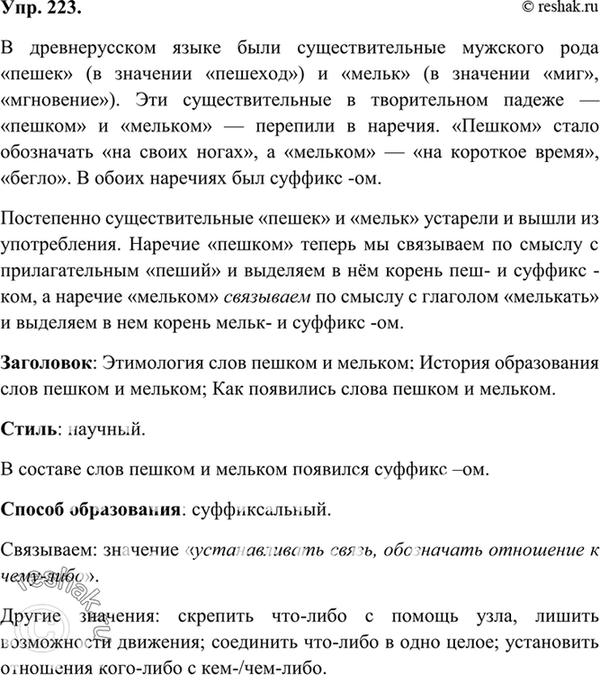 Озаглавьте текст. К какому стилю он относится? Что изменилось в составе слов пешком и мельком? С помощью какого способа они были образованы в древнерусском языке? Спишите. В каком значении использовано выделенное слово? Какие ещё значения этого слова вам известны?