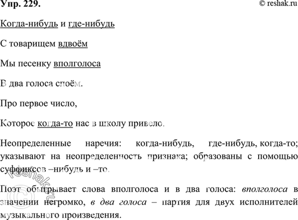 В стихотворении шесть наречий. Неопределённые наречия: когда-нибудь, где-нибудь, когда-то. Они указывают не неопределённые место и время. Образуются при помощи суффиксов -то, -нибудь, -либо.