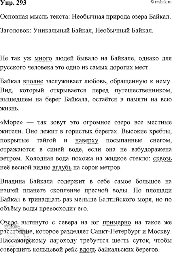 Впадина Байкала содерж..т в себе самое большое на нашей планет.. скопление пресной воды. По площад.. Байкал в тринадцать раз меньше Балтийского моря, но по объёму воды пр..восход..т его.