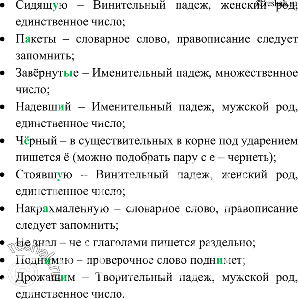 1. Никита на ц..почках вышел в к..ридор и увидел важно идущ..ю ему навстречу девочку в белом. 2. Лиля была одета в белое платье с голубой ш..лковой лентой завязанн..й сзади в болыи..й бант. 3. Девочка всё время смеялась посматривая на огромную куклу, сидящ..ю под ёлкой. Там же лежали бумажные п..кеты с подарками завёрнут..е в разноцветные платки. 4. Аркадий Иванович надевш..й ч..рный долгополый сюртук и коробом стоявш..ю накр..хмаленн..ю рубашку (не)знал, что ему делать2. 5. «А я одной рукой словарь поднимаю», —дрожащ..м от досады голосом проговорил Виктор.