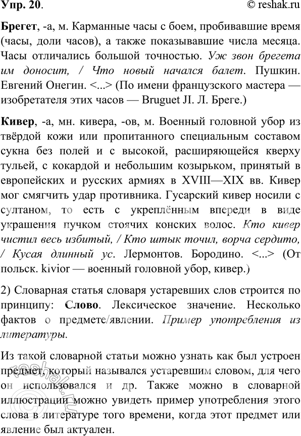 20. 1) Проанализируйте фрагменты словарных статей из «Словаря устаревших слов русского языка» Р. П. Рогожниковой и Т. С. Карской. Брегет, -а, м.