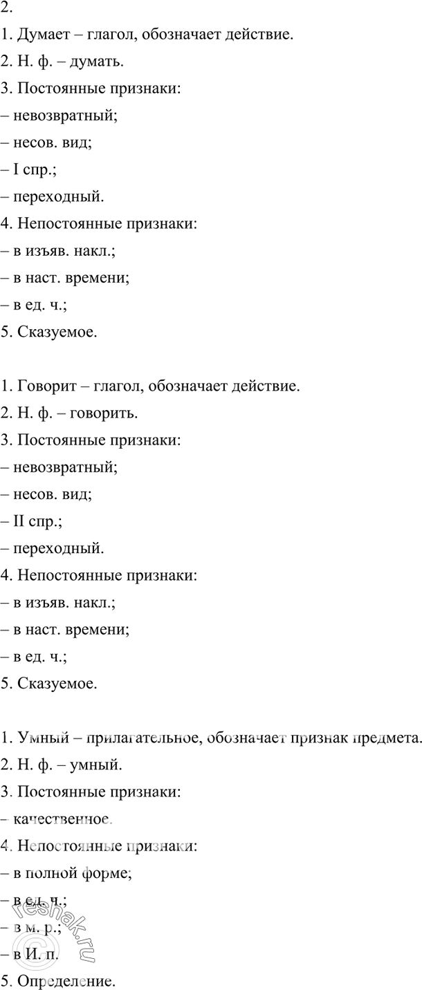 2. Выполните морфологический разбор двух глаголов и двух прилагательных (на выбор).