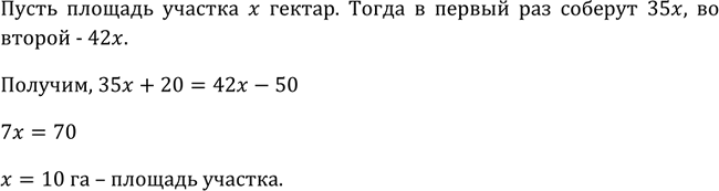 134. Если с каждого гектара участка соберут 35 ц пшеницы, то план недовыполнят на 20 т; если с каждого гектара будет получено 42 ц, то план перевыполнят на 50 т. Какова площадь участка?