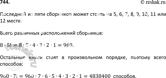 744 Сколькими способами можно расставить на полке 12 книг, из которых 5 книг — это сборники стихов, так, чтобы сборники стихов стояли рядом в произвольном порядке?