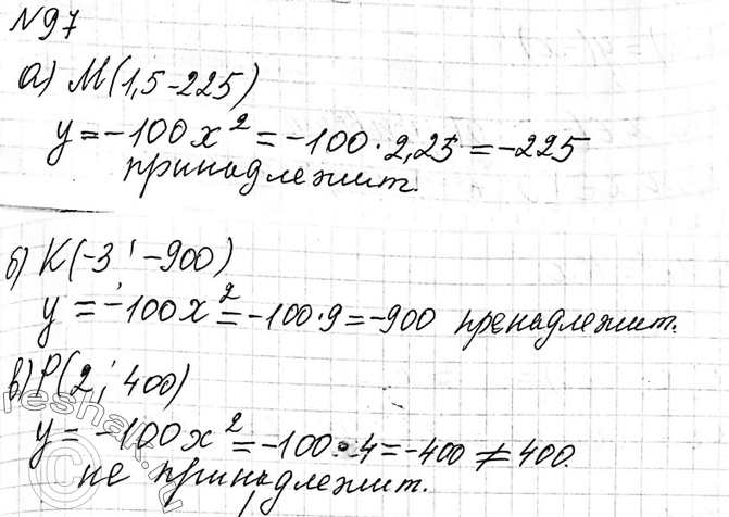 97 Принадлежит ли графику функции у = — 100x2 точка: а) М( 1,5; -225); б) К(-3; -900); в) 2; 400)?