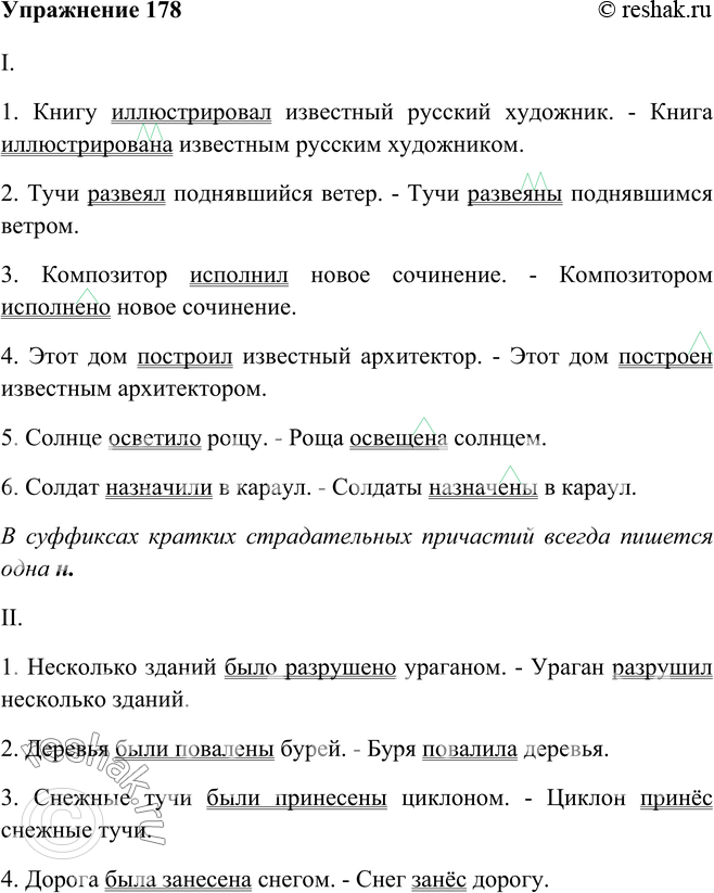 178 I. Перестройте предложения, заменяя простое глагольное сказуемое именным с кратким страдальным причастием. В кратких страдательных причастиях обозначьте суффиксы, объясните их правописание.
