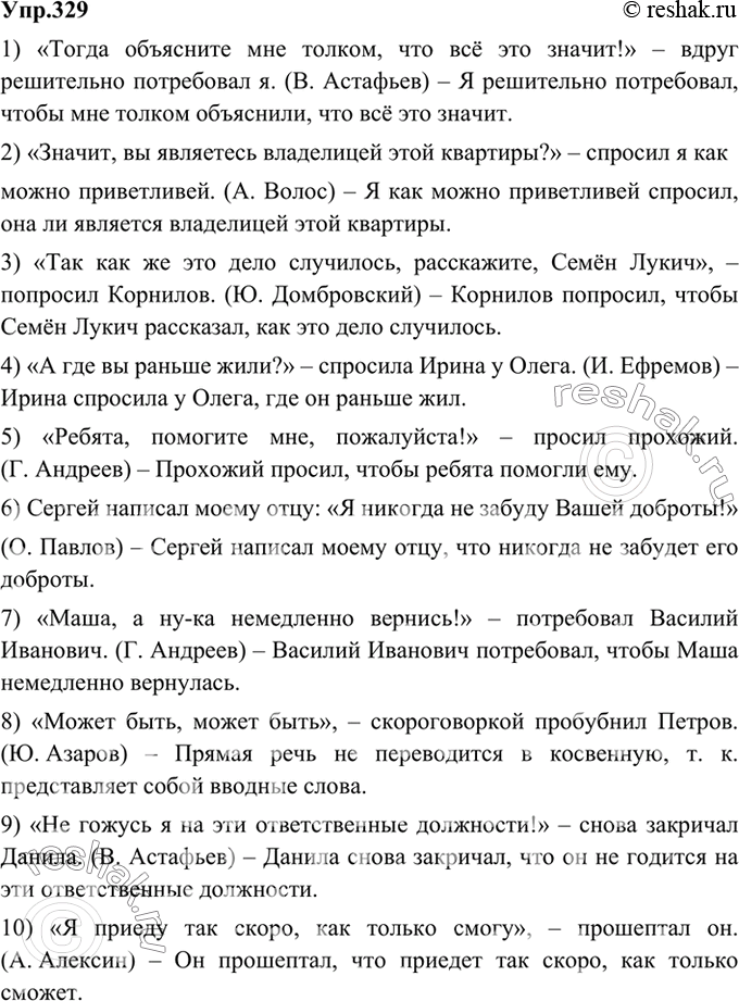 329 Запишите предложения, заменяя прямую речь косвенной. Обратите внимание на правильное употребление глаголов и местоимений в косвенной речи. 1) «Тогда объясните мне толком, что всё это значит!» – вдруг решительно потребовал я.