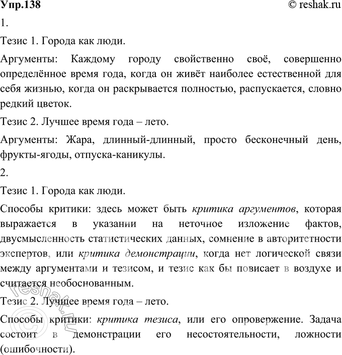 138. Один ученик, выполняя задание предыдущего упражнения, выбрал следующие тезисы: 1. Города как люди. 2. Лучшее время года — лето. 1) Найдите в тексте аргументы, подтверждающие данные тезисы.