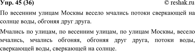 45. Выпишите из предложения все словосочетания. По весенним улицам Москвы весело мчались потоки сверкающей на солнце воды, обгоняя друг друга. По весенним улицам Москвы весело мчались потоки сверкающей на солнце воды, обгоняя друг друга.