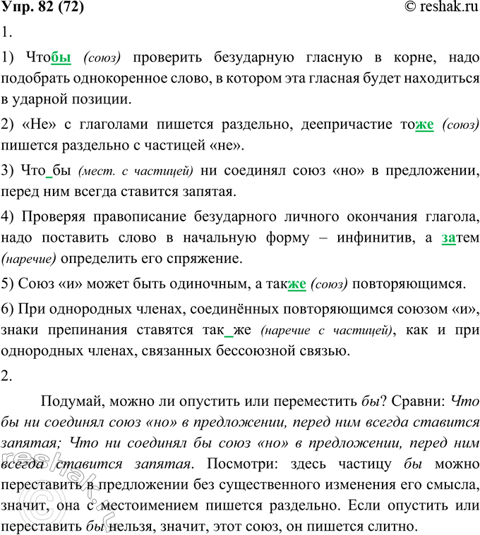 82. 1. Закончите предложения. Объясните, как следует написать, раскрывая скобки, что (бы), то (же), (за) тем. 1. Что (бы) проверить безударную гласную в корне, надо ...