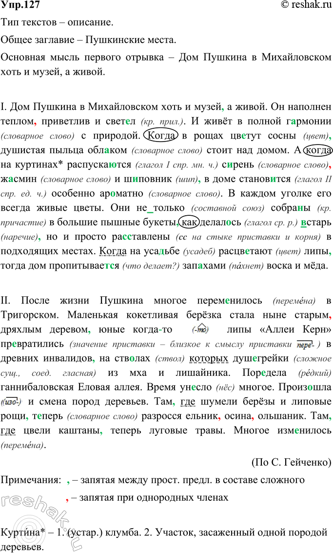 127. Прочитайте тексты и определите их тип. Подберите одно общее заглавие для двух отрывков. Сформулируйте основную мысль первого отрывка. С помощью каких сложноподчинённых предложений описано бережное отношение к памяти А. Пушкина? В каких сложноподчинённых предложениях во втором отрывке показано разрушительное для природы течение времени?