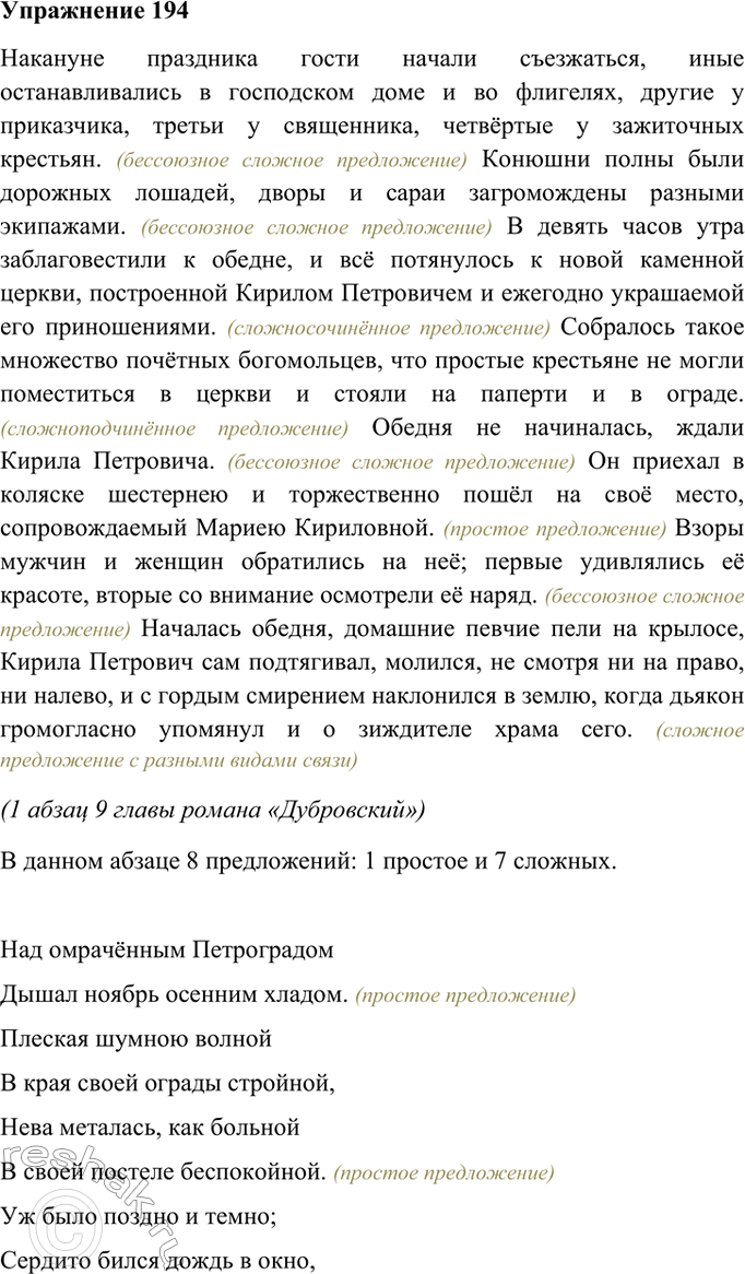 194. Б. В. Томашевский, российский литературовед, исследователь жизни и творчества А. Пушкина, писал, что «у Пушкина проза обладает значительно более простым синтаксисом, чем стихи». Чтобы убедиться в этом, подсчитайте количество простых и сложных предложений в одной из глав прозаического и стихотворного произведений Пушкина, например в первом абзаце II главы повести «Капитанская дочка» и в XL, XLI строфах IV главы романа «Евгений Онегин».