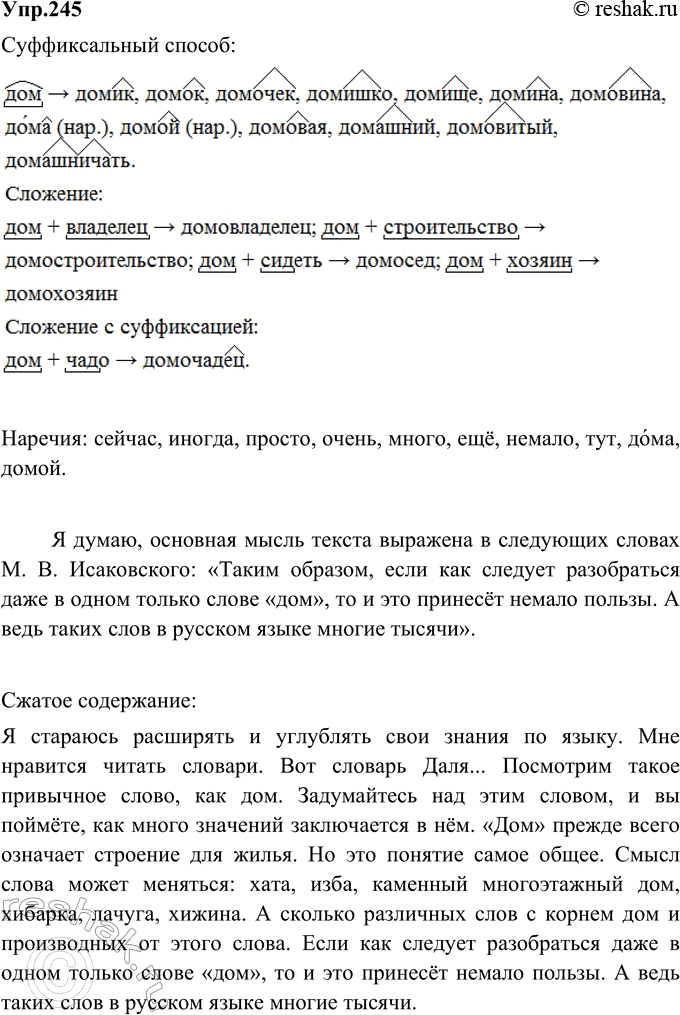 245. Прочитайте текст. Выпишите слова с корнем дом-. Обозначьте в них морфемы и покажите графически способ словообразования. Над наречиями напишите букву н.
