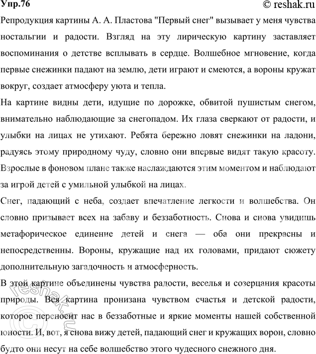 76 Рассмотрите на вклейке (с. 1) репродукцию картины А. А. Пластова «Первый снег» (1946). Напишите, какие чувства вызывает у вас эта лирическая картина, передающая радость детей.
