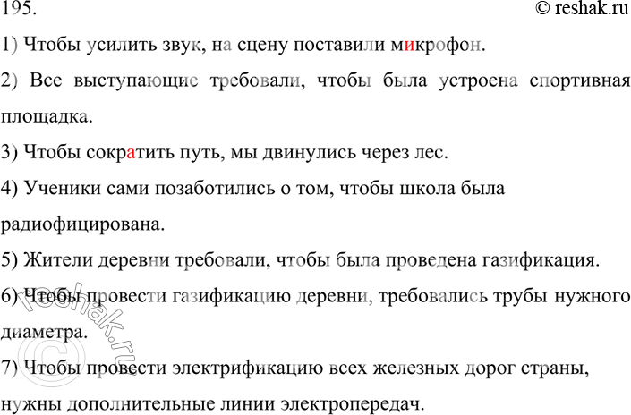195. Спишите, заменяя выделенные слова синонимичные придаточными цели или иъяснительными. Составьте схемы предложений. 1) Для усиления звука на сцену поставили м..крофон.