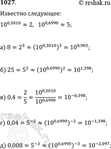 1027. Известно, что 10^0,3010?2 и 10^0,6990?5. Представьте в виде степени с основанием 10 число: а) 8; б) 25; в) 0,4; г) 0,04;