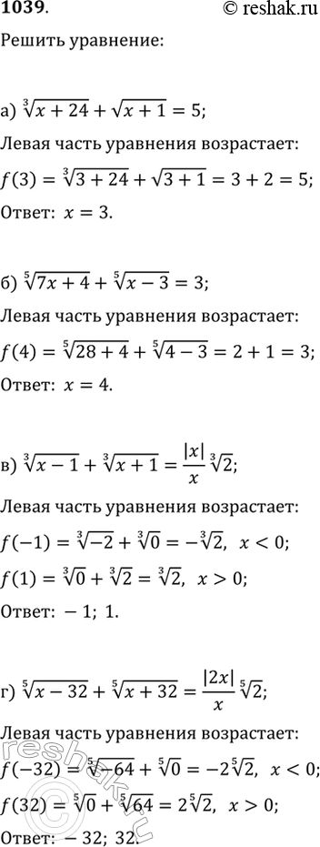 1039. Решите уравнение: а) (x+24)^(1/3)+v(x+1)=5; в) (x-1)^(1/3)+(x+1)^(1/3)=|x|/x 2^(1/3); б) (7x+4)^(1/5)+(x-3)^(1/5)=3; г) (x-32)^(1/5)+(x+32)^(1/5)=|2x|/x 2^(1/5).