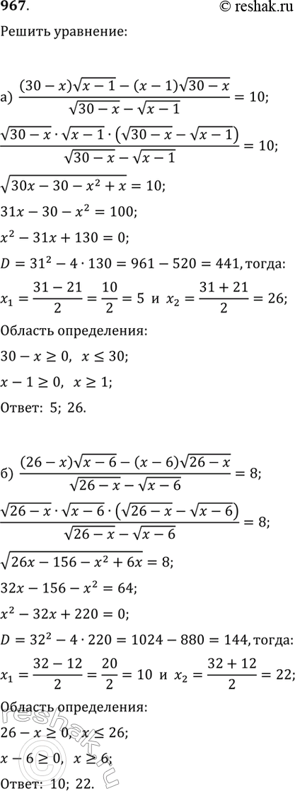 967. Решите уравнение: а) ((30-x)v(x-1)-(x-1)v(30-x))/(v(30-x)-v(x-1))=10; б) ((26-x)v(x-6)-(x-6)v(26-x))/(v(26-x)-v(x-6))=8.
