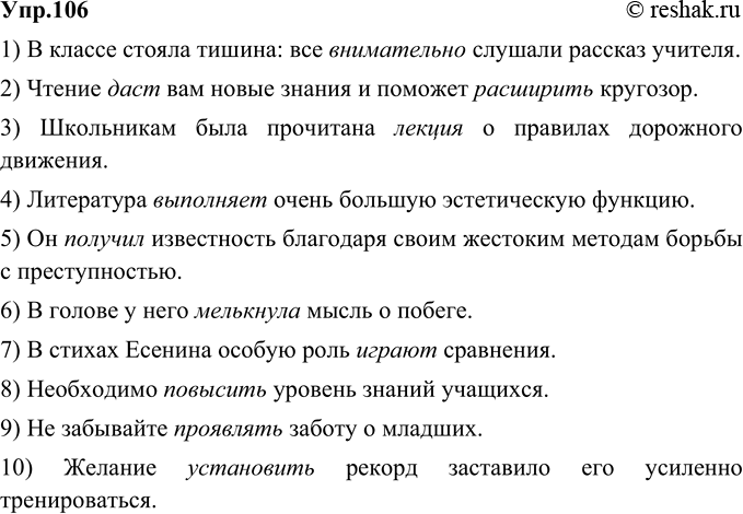 106. Прочитайте предложения. Исправьте ошибки, связанные с нарушением сочетаемости. 1. В классе стояла тишина: все пристально слушали рассказ учителя. 2. Чтение откроет вам новые знания и поможет повысить кругозор.