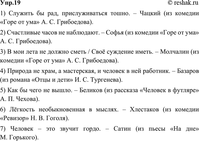 19. Прочитайте высказывания, ставшие в русском языке крылатыми словами. Назовите героев художественных произведений, которым принадлежат эти высказывания. 1) Служить бы рад, прислуживаться тошно.