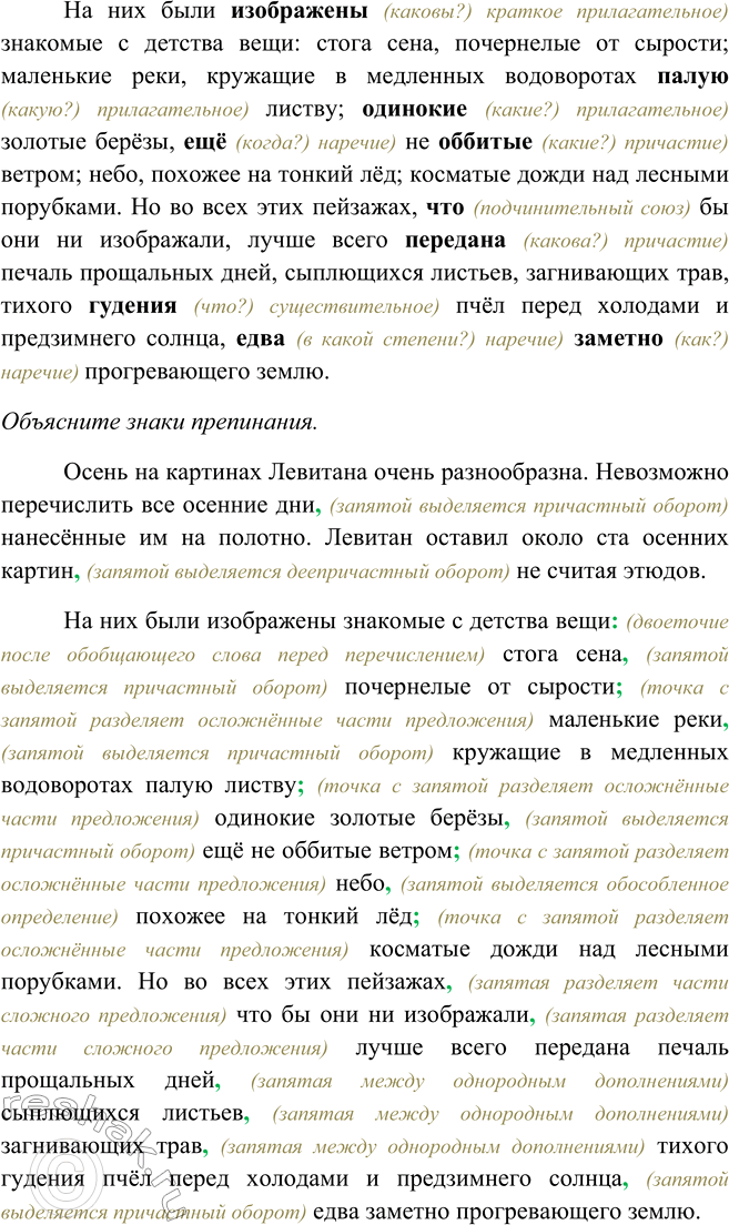 На них были изображены (каковы?) краткое прилагательное) знакомые с детства вещи: стога сена, почернелые от сырости; маленькие реки, кружащие в медленных водоворотах палую (какую?) прилагательное) листву; одинокие (какие?) прилагательное) золотые берёзы, ещё (когда?) наречие) не оббитые (какие?) причастие) ветром; небо, похожее на тонкий лёд; косматые дожди над лесными порубками. Но во всех этих пейзажах, что (подчинительный союз) бы они ни изображали, лучше всего передана (какова?) причастие) печаль прощальных дней, сыплющихся листьев, загнивающих трав, тихого гудения (что?) существительное) пчёл перед холодами и предзимнего солнца, едва (в какой степени?) наречие) заметно (как?) наречие) прогревающего землю.