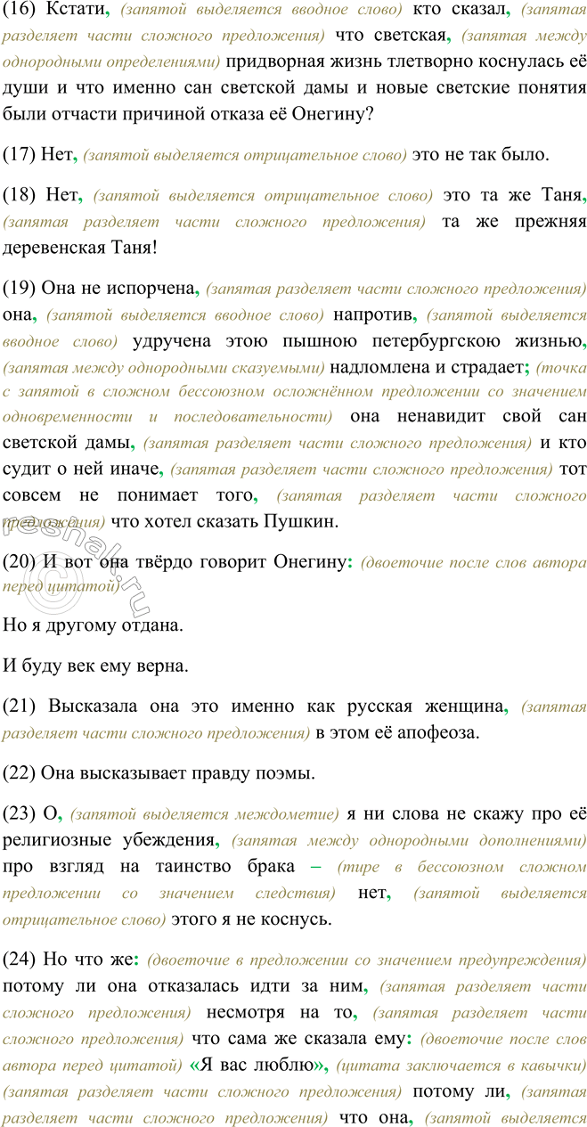 (5) Это положительный тип, (запятая перед противительным союзом а) а не отрицательный, (запятая разделяет части сложного предложения) это тип положительной красоты, (запятая разделяет части сложного предложения) это апофеоза русской женщины, (запятая разделяет части сложного предложения) и ей предназначил поэт высказать мысль поэмы в знаменитой сцене последней встречи Татьяны с Онегиным.