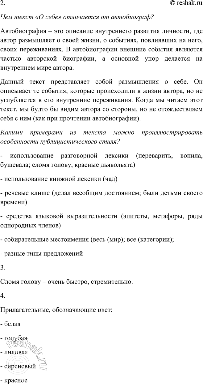 2. Чем текст «О себе» отличается от автобиографии? Какими примерами из текста можно проиллюстрировать особенности публицистического стиля?