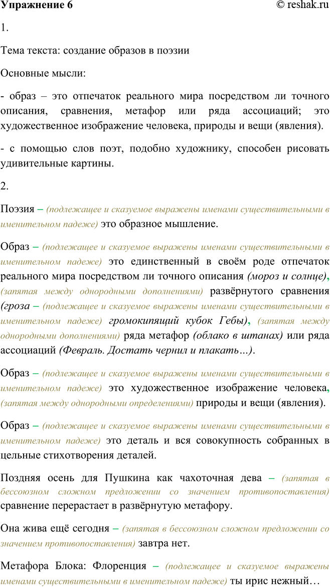 6. 1. Прочитайте отрывок из книги поэта Н. Ушакова «Мастер-ская». Определите тему, основные мысли текста. Поэзия — это образное мышление. Образ — это единственный в своём роде отпечаток реального мира посредством ли точного описания (мороз и солнце), развёрнутого сравнения (гроза — громокипящий кубок Гебы), ряда метафор (облако в штанах) или ряда ассоциаций (Февраль.