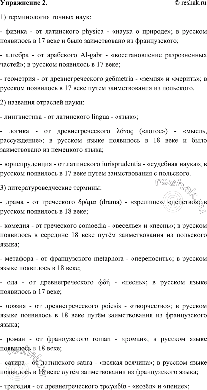 2. Спишите слова, распределяя их по тематическим группам: 1) терминология точных наук; 2) названия отраслей науки; 3) литературоведческие термины; 4) общественно-политическая лексика; 5) военная лексика; 6) природные явления; 7) предметы быта. Определите, пользуясь любым этимологическим словарём или словарём иноязычных слов, из каких языков заимствованы эти слова и когда (если возможно) они появились в русском языке. Как вы думаете, в связи с какими процессами в жизни общества эти слова «пришли» в русский язык?
