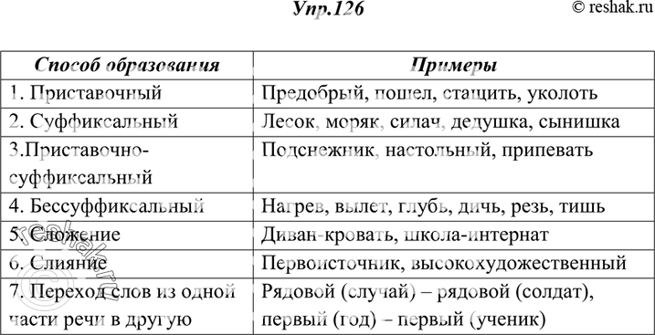 126. Заполните таблицу «Способы образования слов» своими примерами. Способ образования 1. Приставочный 2. Суффиксальный 3. Приставочно-суффиксальный 4. Бессуффиксный 5. Сложение 6.